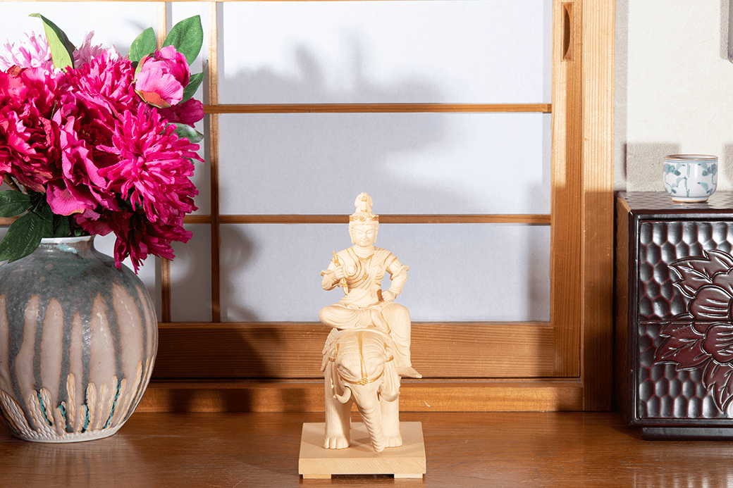 古くインドでは、武神インドラと呼ばれ、ヴァシュラという金剛杵を武器にして凶暴な魔神と戦った雷神です。天部の神を統率する神とも言われており、梵天とペアを組んで釈迦が悟りを開くのを応援した仲間です。性格は豪快で阿修羅の娘をさらって妻とした事で、阿修羅と戦いを繰り広げました。仏像界随一の美しい顔立ちと言われております。